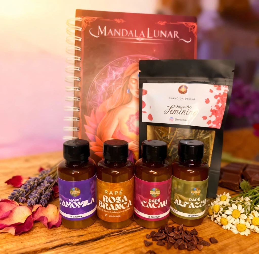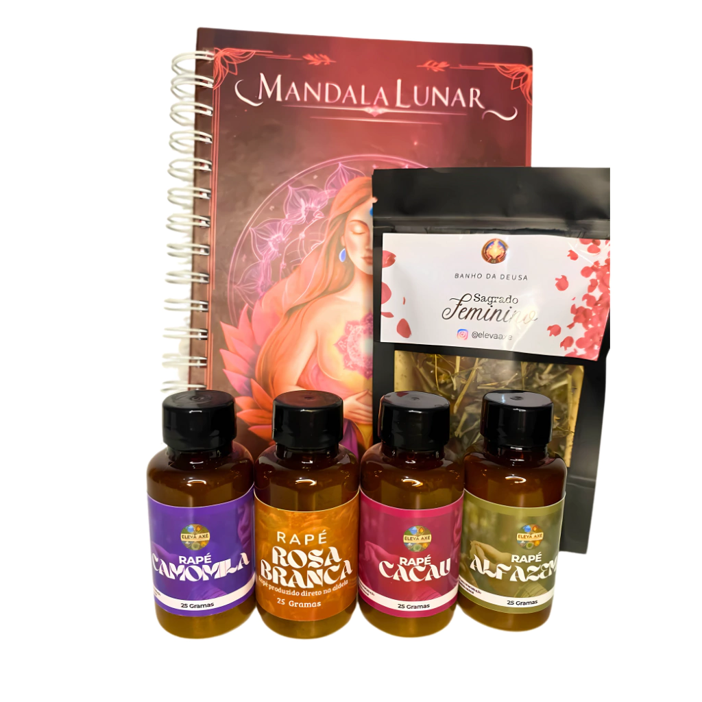 Descubra o Kit Sagrado Feminino, uma seleção especial que combina quatro rapés: Camomila Cacau, Alfazema, Rosas Brancas e um Banho Sagrado Feminino. Este kit é ideal para quem busca equilíbrio, autoconhecimento e conexão espiritual.