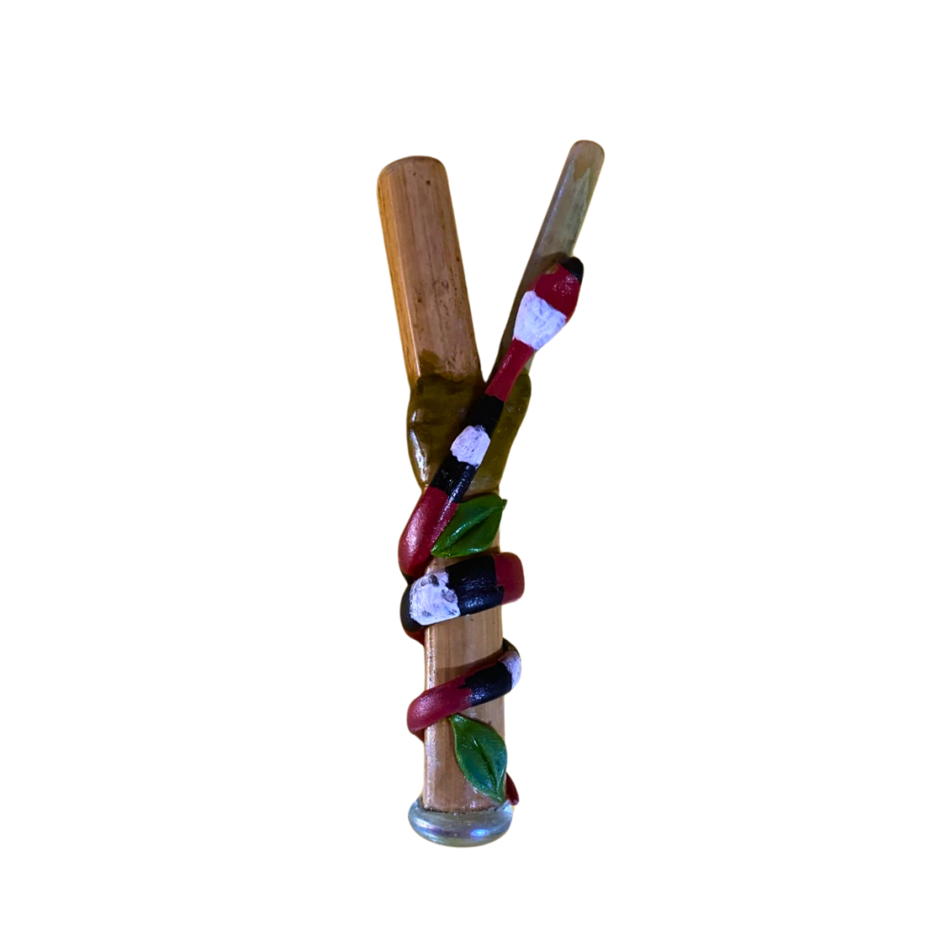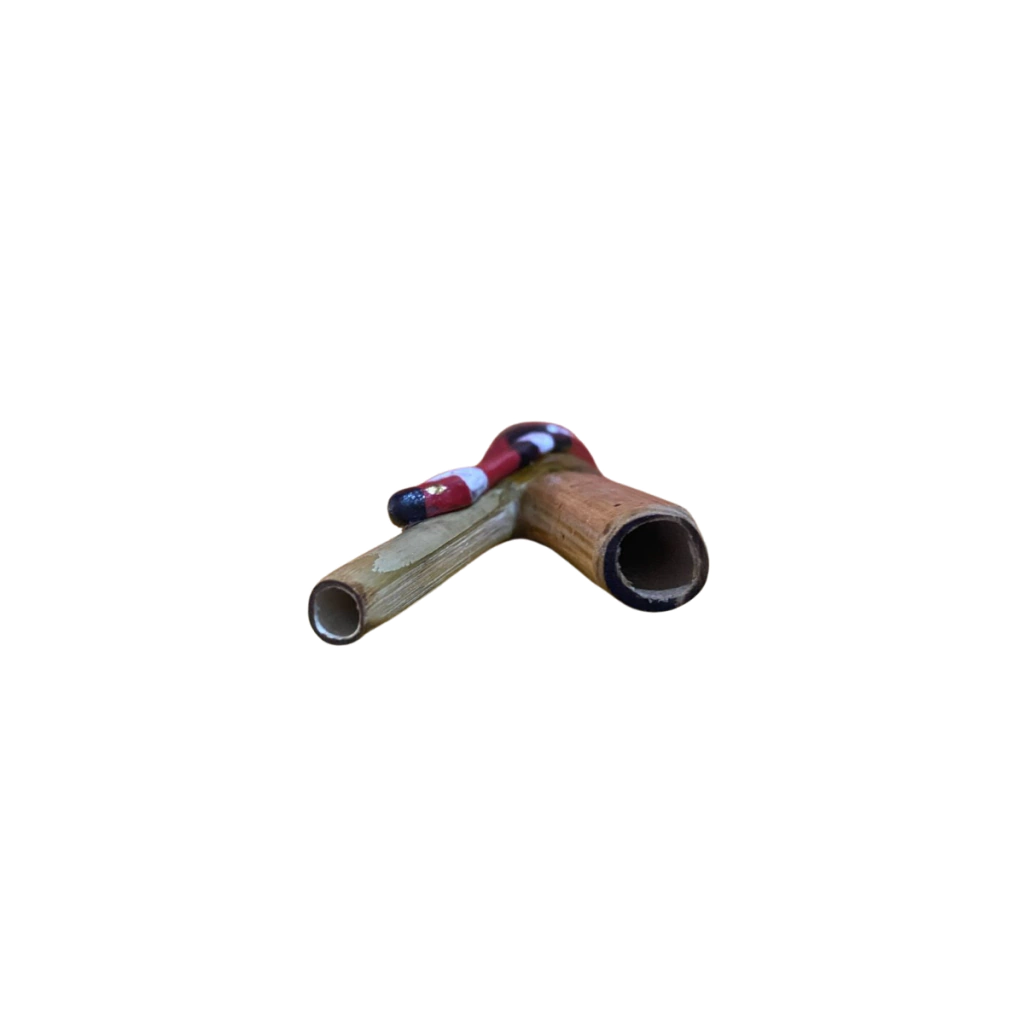 O Kuripe Cobra Coral é uma peça única, feito de bambu modelado à mão, com 12 cm de comprimento, ideal para a aplicação de rapé. Este instrumento tradicional é indispensável para aqueles que buscam uma conexão mais profunda com as medicinas da floresta.